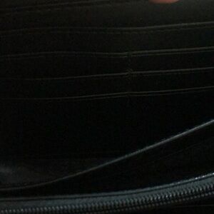 Authentic Kate Spade Black Pebble Leather 4 Compartment Wallet Zip Pocket Zip-A-Round. One zipper pocket inside 2 sections of CC I’d Slots and one open pocket. One open pocket on back. Lining is logo. This wallet is in EUC with the leather pull on the zipper is damaged so I have cut it down/works perfectly. Measures 8X4