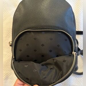 Elegant black pebbled leather backpack by Kate Spade. Features front zip pocket and adjustable straps.