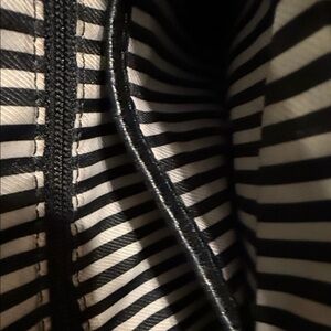 Chic black crossbody bag by Kate Spade. Features pebbled leather and front zipper detail. Ideal for everyday use. Black and white striped interior.