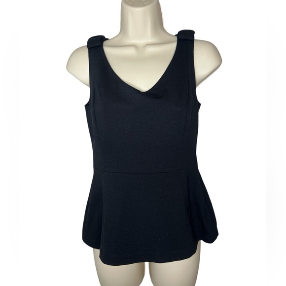 Chic black tank top with peplum design. Sleeveless and stylish with bow on shoulders. Perfect for any occasion.