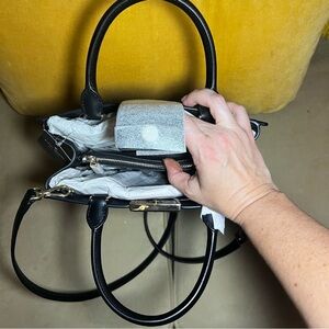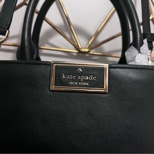 Elegant black leather handbag with gold accents. Features sturdy handles and signature logo plaque.