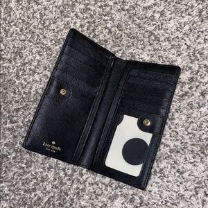 Chic black clutch by Kate Spade. Features Saffiano leather texture. Perfect for any occasion.