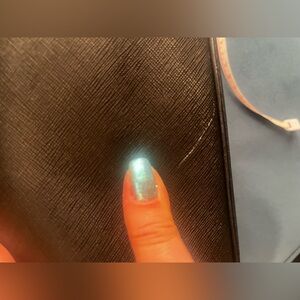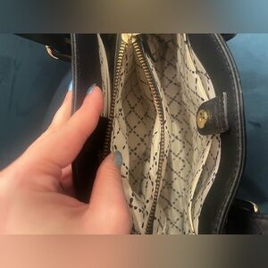 2015 Kate Spade medium black saffiano leather and gold tone hardware satchel in good used condition, shape has relaxed due to age/wear, two areas with minor scratches that should buff out. Bag has two interior zip pockets, two small interior side pockets, and removable shoulder strap. Adjustable bag handles have approximately 3.5” drop, bag measures approx. 5.25” wide by 7.5” tall by 11.5 inch long. Fits large wallet, large phones, ereaders, and iPad mini. From a smoke free home, offers welcome!