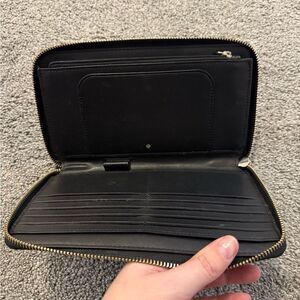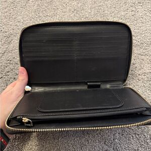 Large zip around style wallet. Lots of card clots and inner zippered pockets. Inside slots and one exteri slot on back. Excellent condition. Great for a travel wallet too. Lots of storage