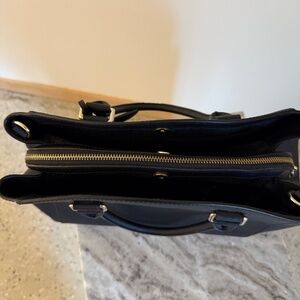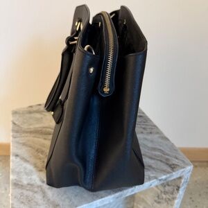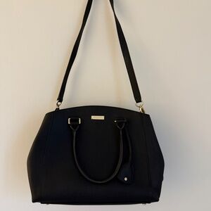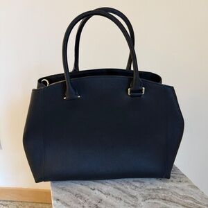 Elegant black shoulder bag. Features dual handles. Sleek and stylish design.