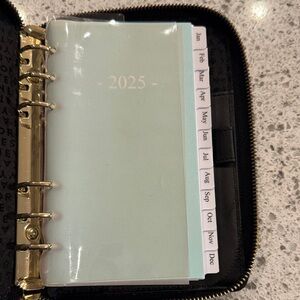Elegant black leather pouch by Kate Spade. Features a textured finish and secure zip closure. The planner pages were purchased off Amazon for 2025. If any questions, please ask.