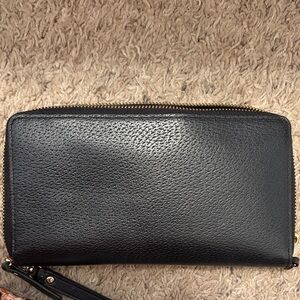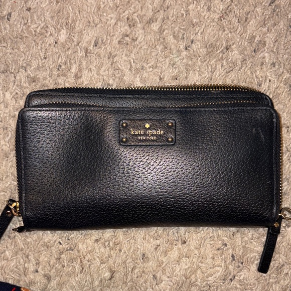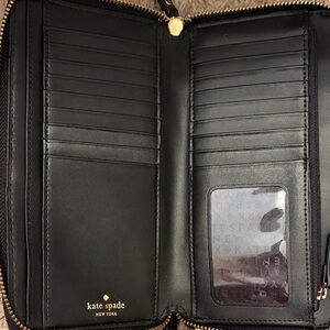 Elegant black wallet by Kate Spade. Features textured leather and zip closure.
