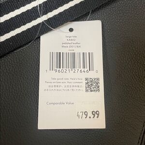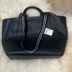 Chic black tote with stylish striped handles. Features iconic Kate Spade logo.