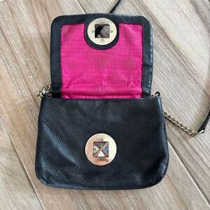 The Kate Spade Astor Court Naomi crossbody bag is a chic addition to any wardrobe. Crafted from luxurious black leather, its quilted exterior exudes sophistication, while the gold-tone chain and leather strap add a touch of elegance. The flap closure opens to reveal a delightful pink fabric lining with an interior slip pocket, perfect for keeping essentials organized. Ideal for casual outings or a stylish brunch, this medium-sized bag is both practical and fashionable. Pre-owned with minor scratches and discoloration on the metal closure.