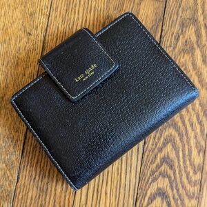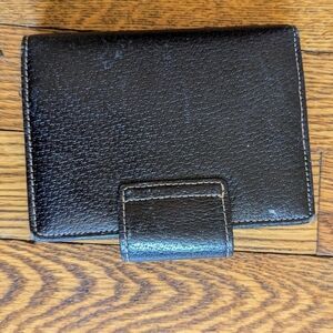 Elegant black wallet. Textured leather. Snap closure. Gold logo detail.