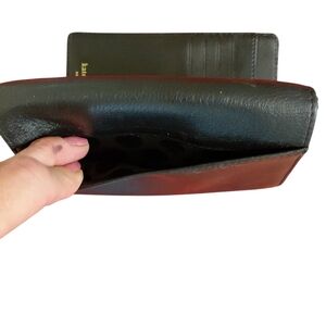 Elegant black wallet. Sleek design. Gold logo detail. Great for everyday use
