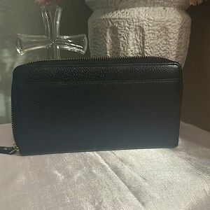 Elegant black wallet with gold logo plate. Sleek design. Perfect for everyday use. New without tags has gold tone hardware zip closure inside has one zip pocket has 12 cards slots and five large slip pockets ,inside is tan and pink smooth leather one large sit pocket on back. Make a great gift to yourself or someone else