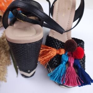 Stylish black woven platform sandals by Kate Spade. Features colorful tassels for a playful touch.