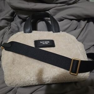 Stylish crossbody bag with a plush cream body. Features sleek black handles and strap. Perfect for versatile wear.