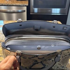 Stylish tote with a snakeskin design. Features black and cream colors. Ideal for everyday use.
