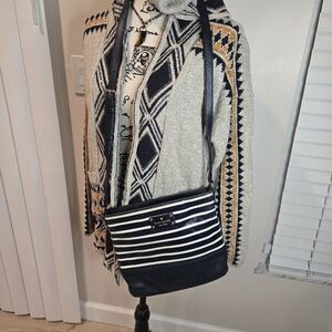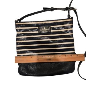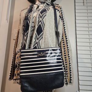 Stylish and versatile, this Kate Spade bag features a chic dark blue and cream striped design. Perfect for any occasion, it adds a touch of elegance to your outfit.