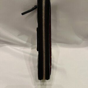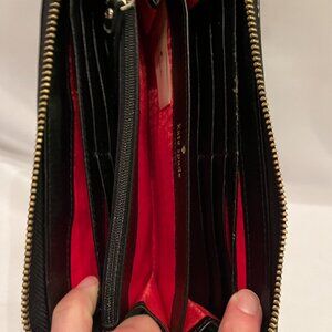 Black and ivory single zip accordion wallet with gold accents. This item boasts several flat pockets for cash on the inside and an open pocket on the back (outside). 12 credit card slots and central zip pocket for coins. A nice pop of red in the center of the inside of the wallet gives a luxury feel. Plenty of space for all of your items. Measures about 7 3/8" by 4" and easily zips with my iPhone 13 (with case) inside. No rips or stains. Slight wear on the zipper pull (see picture). Non smoking home.