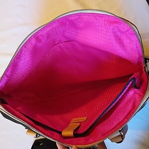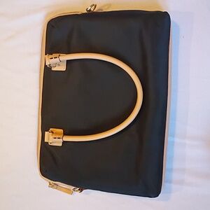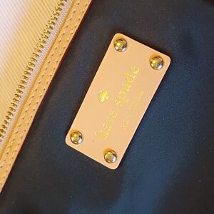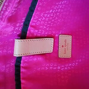 sleek and simple lightweight nylon bag with tan nude color leather accents. Kate Spade New York measurements of the outside of the bag is 17 in by 12 in. comes with an over shoulder strap. used good to very good condition has one pen mark on the inside otherwise inside is clean. very minor indentation mark on bottom leather strip see close up picture.
