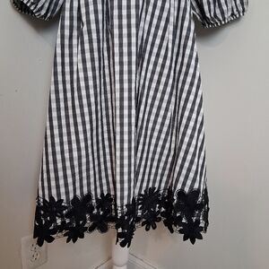Charming black and white gingham dress featuring delicate floral accents. Perfect for any occasion.
