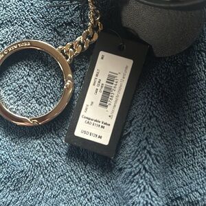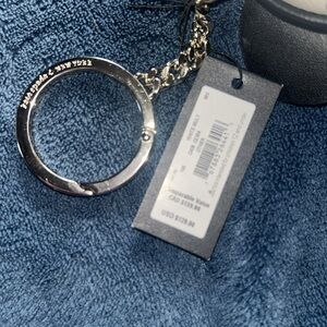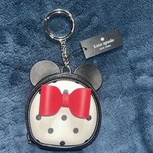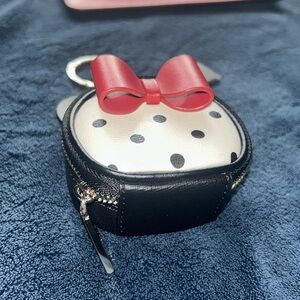 Charming coin purse with polka dots. Features a bold red bow. Includes a keychain ring. Iconic Kate Spade style.