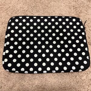 Carry your favorite technology in this Kate Space black and white polka dot design neoprene sleeve. Measuring 14” x 10.25” this technology sleeve will fit a variety of tablets and laptops. In good used condition.