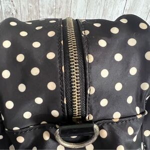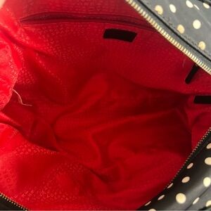 So cute with the bright red interior and polka dot outside. Comes with the crossbody strap. There is some wear on the corners, as shown in photos. Also some slight discoloration on the high traffic areas of the main zipper and could use a stain treatment. No rips.