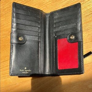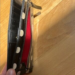 This elegant Kate Spade wallet showcases a striking black and white polka dot pattern, offering a timeless and sophisticated look. Its sleek design and glossy finish make it a standout accessory for any occasion. Perfect for those who appreciate a blend of classic style and modern flair.