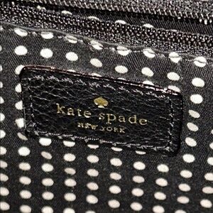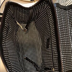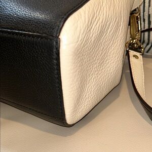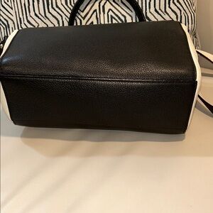 Elegant black satchel with white accents. Features top handle and adjustable strap. Gold-tone hardware adds a chic touch.