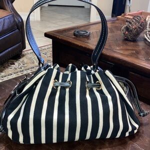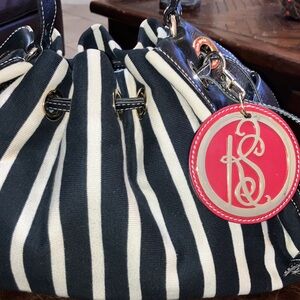 Kate Spade Black and White Striped Bag w/large charm and leather embossed bottom