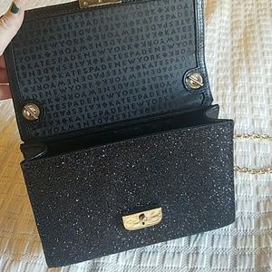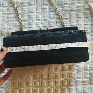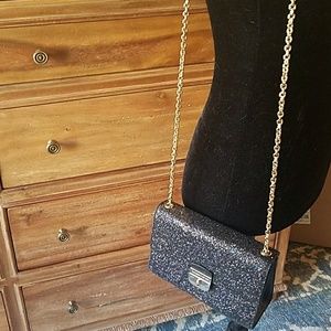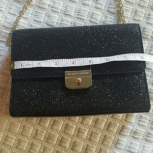 Black glitter purse with long gold chain. Chain can come off if you want as a clutch only. Drop is around 22 inches to top of purse.