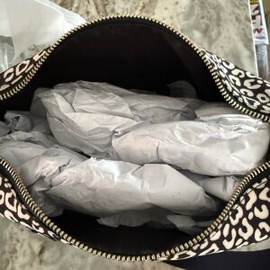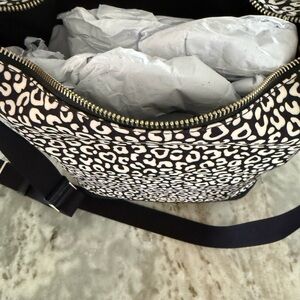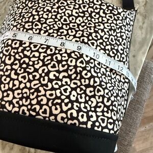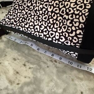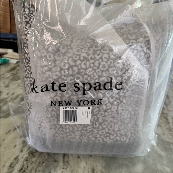Stylish shoulder bag with a blk/wht leopard print. Features iconic Kate Spade branding. Zipper closure. Black leather trim. Inside slip pocket and a zipper pocket. Like new. Used once.