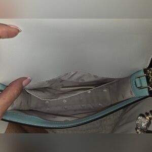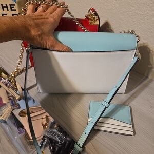Stylish and vibrant, this Kate Spade crossbody bag features a striking Tiffany blue and white color combination. Perfect for adding a pop of color to any outfit. comes with matching card wallet