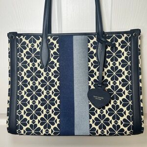 Kate Spade tote, Kate Spade market tote, Kate Spade floral bag, Kate Spade jacquard handbag, Kate Spade medium tote, Kate Spade blue stripe bag, Kate Spade purse, leather trim tote, designer tote bag, Kate Spade work bag, Kate Spade everyday bag, Kate Spade shoulder bag, Kate Spade handbag