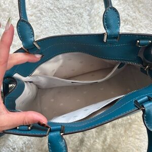 This stunning blue satchel from Kate Spade features a structured design with top handles and gold-toned hardware accents. Crafted from high-quality materials, it offers a smooth finish and a classic shape, making it a versatile choice for everyday use. The rich blue color adds a touch of elegance to any outfit.