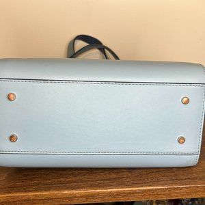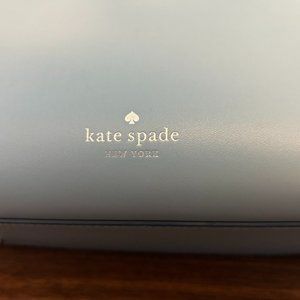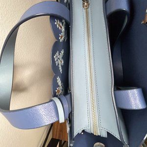 This is a Kate Spade handbag that has the color blue dawn with a darker blue inside. Rare design with scalloped trim and flower eyelet pattern. Matching key ring attached.