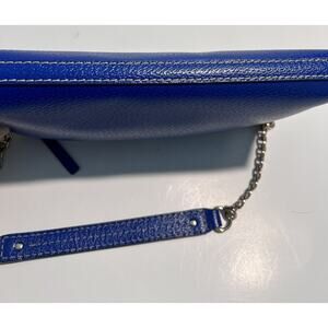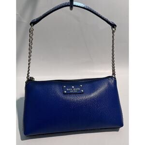 Kate Spade, Blue, Shoulder bag with Chain and Leather Handle, Preowned. This is a gorgeous, Blue, Kate Spade Bag with Silver Hardware. There is white heavy stitching around the bag adding beautiful contrast. The strap is half chain and half leather. The zippered compartment opens to a cream and gold polka dot lining with one zippered pocket on one side and two open style pockets on the other side. This bag is in great condition and was hardly used. #206