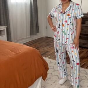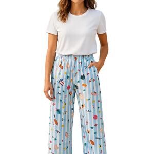 Kate Spade blue and white striped pajama pants. Allover stripes and a cute vacation motif. Elastic waistband. Wide leg. Pulls on. Polyester / elastane. Machine wash. KS92315T. New without tags.