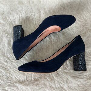 This is a pair of round toe, blue suede leather, sparkle glitter block heel pumps from Kate Spade New York. Very little wear on foot beds, light wear on soles. 8M.