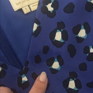 This elegant Kate Spade sundress features a vibrant blue hue with a delicate white pattern, perfect for casual or work settings. The sleeveless design and V-neckline offer a chic and breezy look, while the mini length and A-line silhouette add a touch of playful sophistication. Stain as pictured not very noticeable because of pattern. Best for HOC Winter