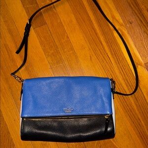 Stylish crossbody bag. Features vibrant blue and classic black. Perfect for any occasion.