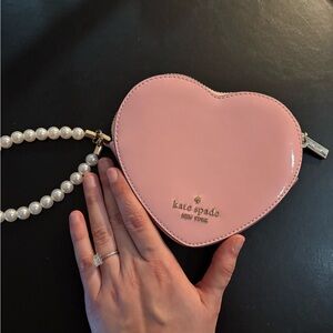 Elegant heart-shaped wristlet by Kate Spade. Features a stylish pearl handle.