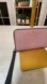 Chic blush leather wallet. Gold zipper detail. Striped interior for stylish organization.