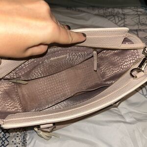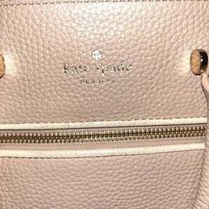 Chic blush leather bag by Kate Spade. Features textured design and front zip accent.