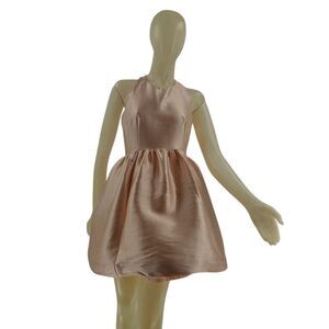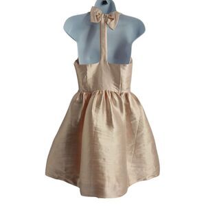 Kate Spade blush pink mini dress with statement bow back and racerback cut. Features a hidden side zipper, structured puff skirt, and side pockets. Fit and flare silhouette in a silk/poly blend. Size 2, in excellent condition.