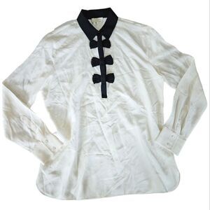 Beautifully designed by Kate Spade, Go Fly A Kite cream blouse features black bow placket, black collar, and button cuffs. 100% silk. This is in very good pre-owned condition. A little wrinkled from storage.