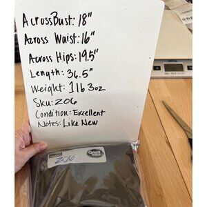 Measurements: Across Bust = 18", Across Waist = 16", Across Hips = 19.5", Length = 36.5". Condition: Excellent, like new.