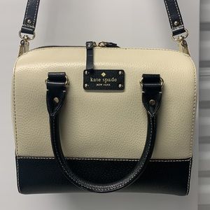 Kate Spade Bowling Bag Purse Black Cream Leather Satchel Crossbody Strap Handbag