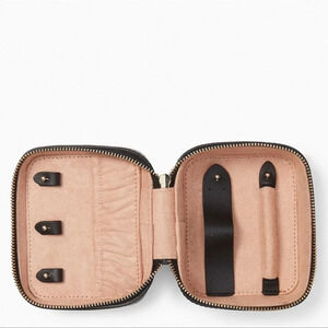 Can hold: 3 necklace posts with elastic pouch below on top. 10 earring posts and ring holder on bottom.