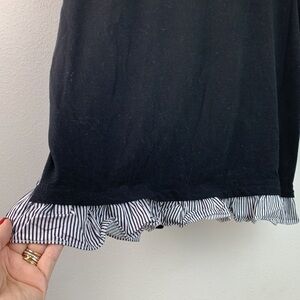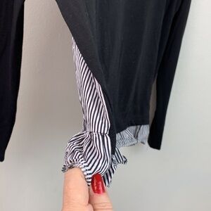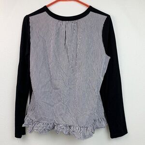 Kate Spade Broome Street fine black knit front and striped cotton back long sleeved top with a ruffle trim.