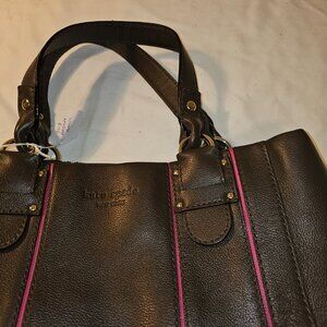 NWT - This Kate Spade leather handbag is brown with red accent trim. The main compartment has 2 zippered and 2 slip in pockets. Handbag has metal studs, metal rings to prevent tears to the handle. 9H x 11W
